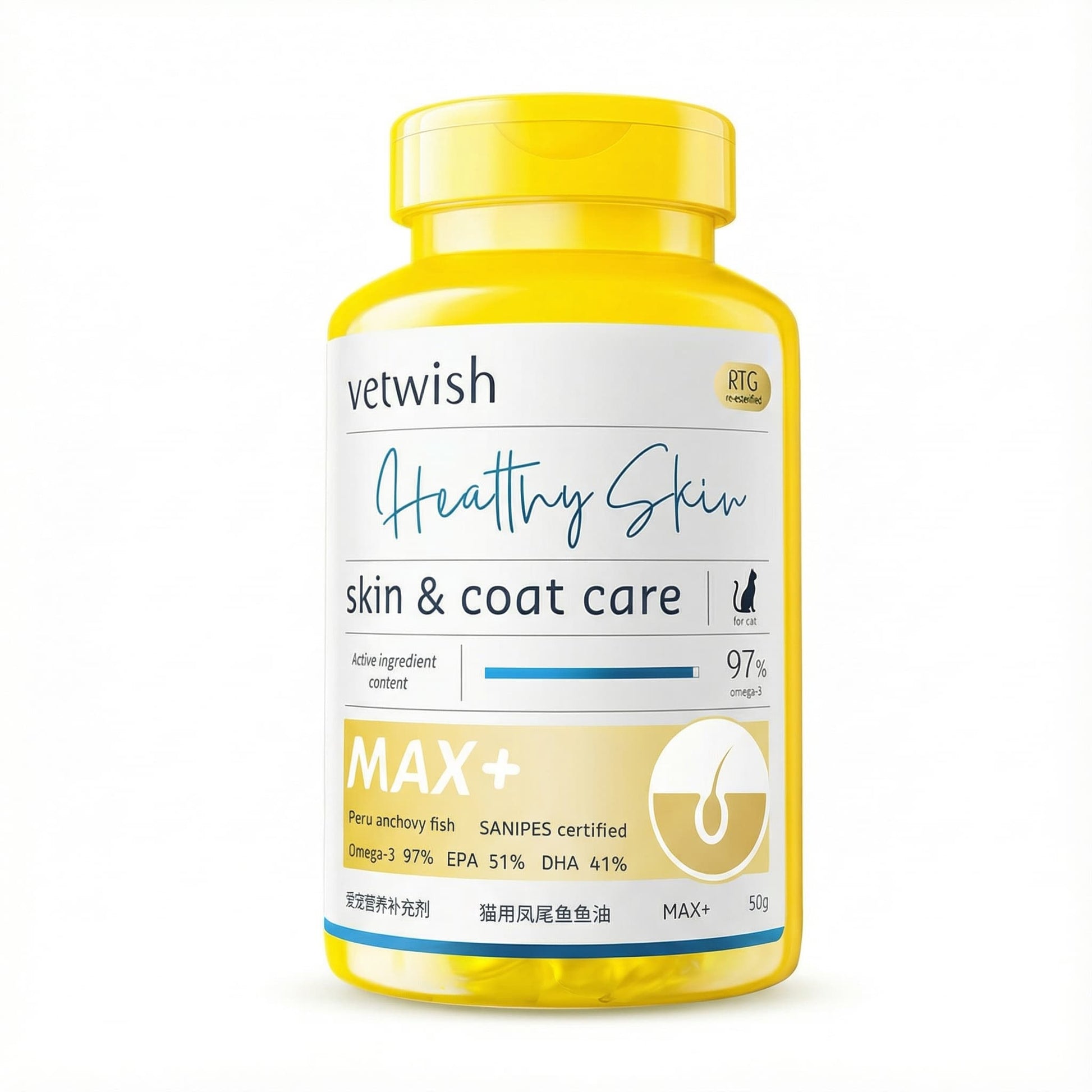- 97% concentrated rTG form: cats absorb 91% of this (vs. 20–30% from standard fish oils)—it's the molecular structure their bodies recognize.